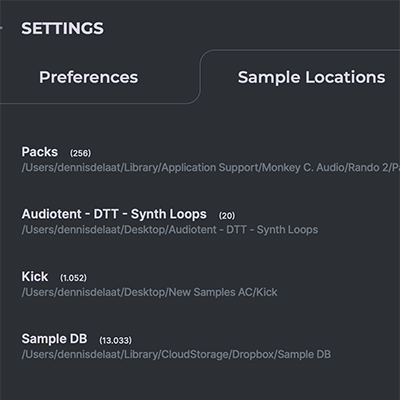 Rando's search engine indexes entire libraries quickly, even across multiple drives. Filter by loops, one‑shots, categories, or text in filenames; find the perfect sound fast.