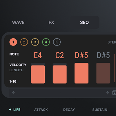 The built‑in sequencer creates 64‑step patterns with randomization at the click of a button. Adjust swing, spacing, lock steps, or reroll patterns; play around until you find magic. Render your sequences as MIDI or audio—drag them straight into your DAW.